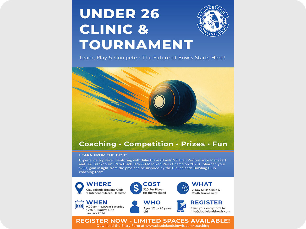 A two day event for 12 - 26 year old's to get some top-level mentoring and help from the Claudelands Bowling Club.